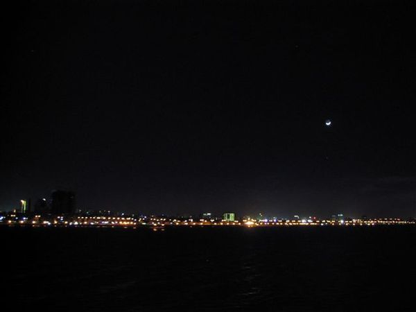晨曦前的墨爾本港,這顆月亮拍得還真特別,由此圖可證月亮的確是圓的,亮弧的部份只是太陽光反射造成的形狀而已。