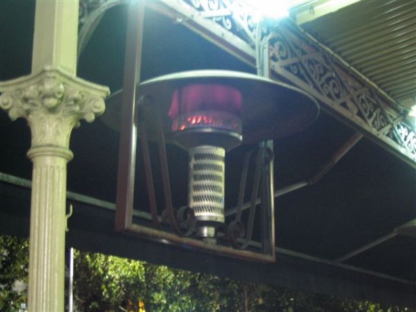 注意到掛在人行道屋簷下的烤燈了嗎?墨爾本即使是夏天的夜晚仍然是蠻冷的,餐廳的露天座位就用這種吊著燒火的暖爐讓客人取暖